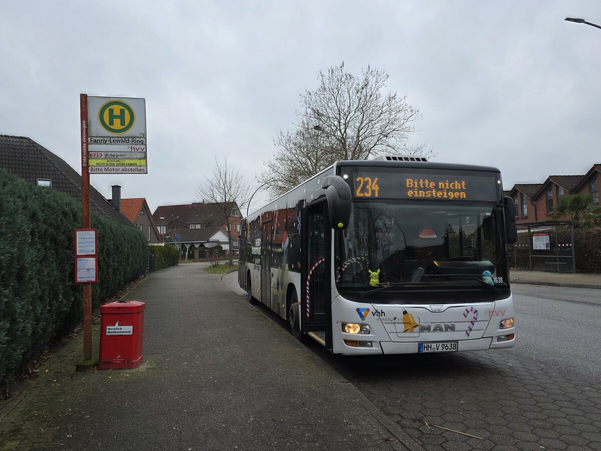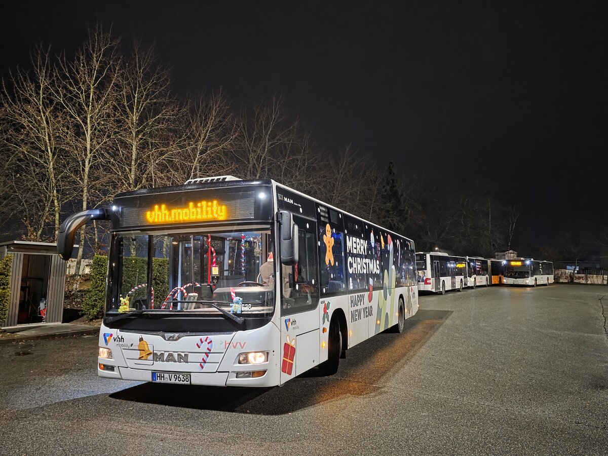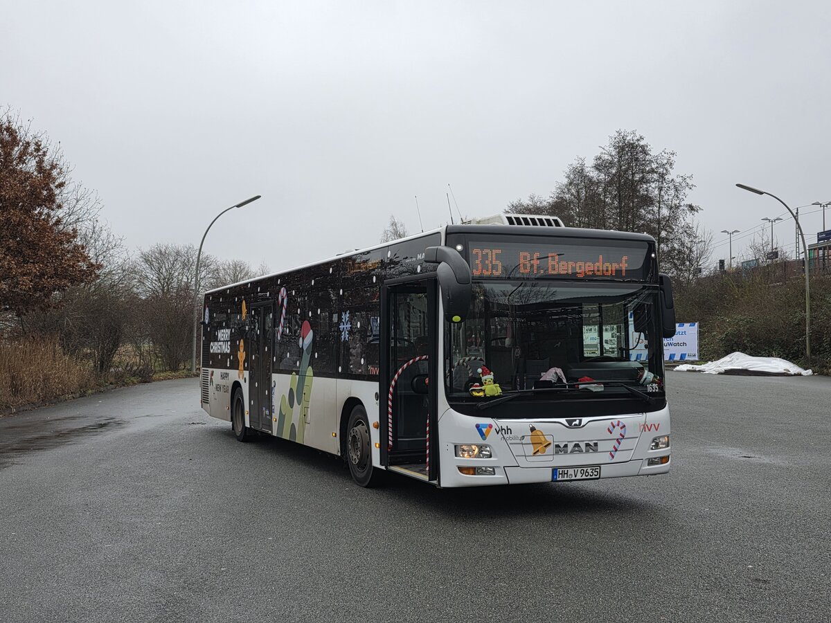 VHH 1638 (HH-V 9638) (Werbung : Weihnachtsbus 2025) als 335 nach Bitte nicht Einsteigen an der Haltestelle S Allermöhe. 1.Januar 2026