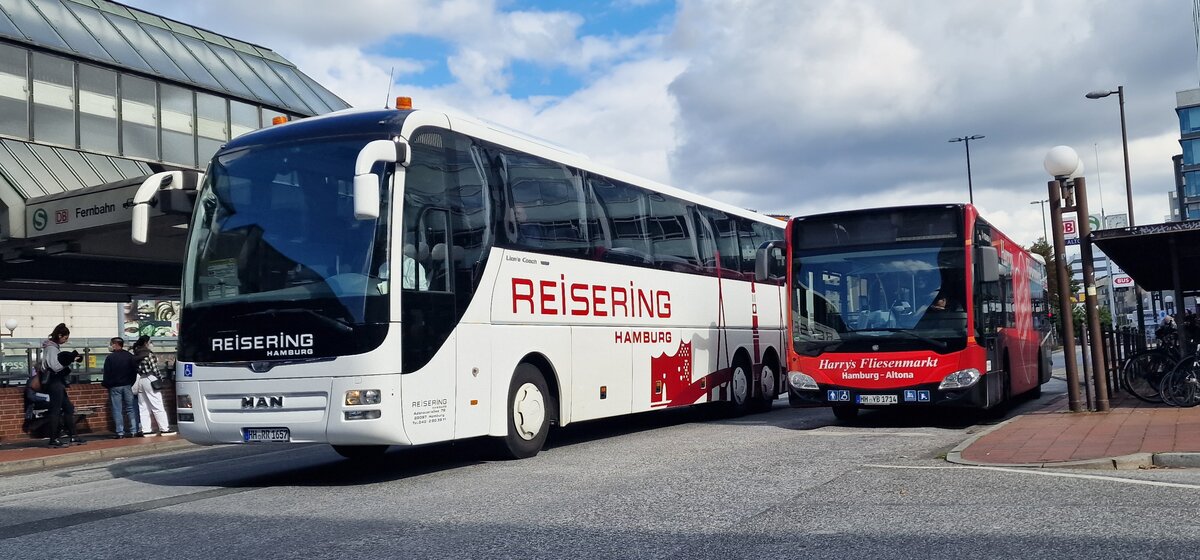 HH-RR 1657 ein MAN R09 Lion Coach von Reisering und HHA 1714 (Harry´s Fliesenmarkt (POP)) am Bf. Altona. 13.Mai 2023